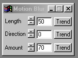 The Motion Blur operation will create a blurred effect the length and direction that you specify. This operation is used to achieve effects similar to turning wheels, moving heads, or any other motion that may cause a blurred look. It is important to remember that due to the large number of calculations, the Motion Blur operation is one of the slowest effects in this software. This operation gives you control over the length of the blur, direction, and the amount of the effect.