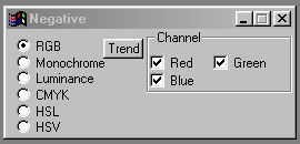Selecting one of these check boxes will force the operation to evaluate and perform the negative using that color space only. If the color space contains multiple channels, a list of all the available channels for that color space will appear to the right of the Color Space check boxes.