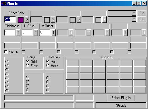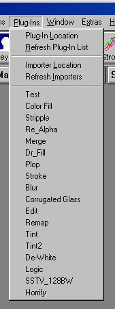 In addition, you can load plug-ins using the menu system; WinImages F/x searches out all installed plug-ins and places them on the menu for you to directly select. Note that selecting one from the menu does not pick the plug-in operator if another operator is selected, but it does load the specified plug-in so when you do change to the plug-in operator, the correct plug-in will already be loaded and ready to go.
