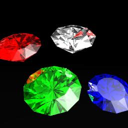 This term should be used before every group of objects that are conceptually one item; the group should then be followed by the To explain a little more, when you make a complex object that is to have the appearance and lighting behaviour of being solid, you construct it out of the relatively simple primitive objects the tracer can render: Triangles, spheres and rectangles. In the case of our faceted gem examples, the objects are made up of a fairly large number of triangles, placed and sized precisely where the faceted surfaces of a gemstone would be. Because refraction takes place when light transits from an objct of one IOR (index of refraction) to an object (or non-object) with a differing IOR, the tracer must know when light is entering and leaving a specific multi-primitive object in order to correctly adjust the light rays. In the case of these gems, light can enter the object through a facet and it can exit the object though a facet; in both instances, the IOR is known to change, so the light ray is bent (refracted) appropriately. It is entirely possible for an object to have internal structures of the same (or different) IOR and/or translucency; if that is the case, the renderer knows what to do based on which structure the objects belong to.