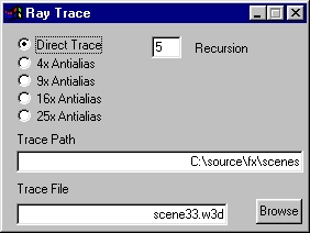 This selects the Trace File that controls the scene to be traced. The trace file contains a script that describes the objects in the scene, the lighting for the scene, and any animated parameters for the scene. Trace files are written using SceneScript; see below for details.