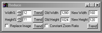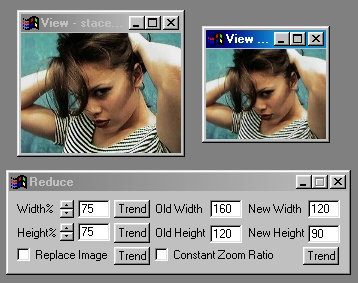 The Reduce operation allows you to decrease the size of a selected view by a percentage amount. For instance, this means that a 640 x 480 image could be reduced to a 320 x 240 image. It is important to remember that reducing an image, no matter what its resolution is, will lose image information. The loss of information can be minimized by only reducing an image by small amounts.