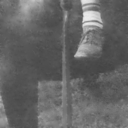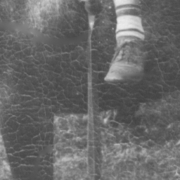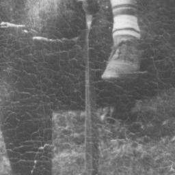 | In this example, we use part of an image of a child riding a horse that has some extremely difficult problems. Not only does this section of the photograph contain torn surfaces, but it also is covered with "crazing" artifacts. You can see that the remove feature not only was able to remove the tears, it did not pick up the crazing and introduce it into the repairs, even though the crazing does intercept the edge of the areas we worked on - the shoe and the major rips. | |