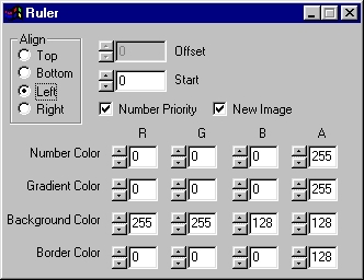 This orients the ruler. A bottom-aligned ruler will have gradients on the top, top-aligned will have gradients on the bottom, left-aligned will have gradients on the right and right-aligned will have gradients on the left. If new image is not chosen, it will align the ruler against it's corresponding edge. These rulers can be moved farther into the image with the offset option, more below.