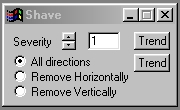 The Shave operation allows you to remove noise and artifacts from images. This can range from single pixels to entire chunks of pixels. This process is a decision based removal system. This means that the pixels are eliminated based on the number of similar pixels in the group, and the colors of each pixel in the group. You can control the Severity of the removal. This severity can range from pixel or dither removal to a very harsh low pass filter. The severity control is analogous to a group of razors which range from dull to sharp. A low severity (dull razor) will shave fewer pixels from the image, and a high severity (sharp razor) will shave more pixels from the image.