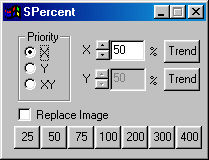 SPercent is short for "Scale to Percentage." You can enlarge or reduce an image by a percentage. Width and height can be scaled indepentently or aspect ratio can be kept.
