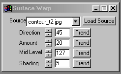 The Source Image Drop Down Box and the Load Source button allow you to select the source image that is to be used for the surface warp operation. Clicking on the drop down box's down arrow will open the box with a list of all of the currently loaded image files. If you have no image loaded, then this box will be empty. You can load a new image, and assign it as the source image by clicking on the Load Source button. This will present you with a file requester for selecting the new source image file. Once the file has been selected, and loaded, it will automatically be specified as the source image. The source image determines how the action view will be warped based on the brightness values in the source image.