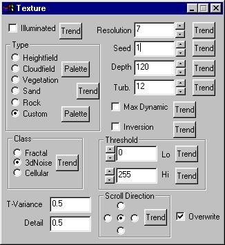 | a=TEXTURE(type, SCROLL[0-4], ILLUMINATE, T-variance, detail, resolution, seed, depth, turb, CLASS[0-2], lo thresh, hi thresh, MAX DYNAMIC, INVERT, OVERWRITE) |