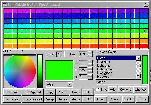 WinImages F/x's palette can load Microsoft Windows Paintbrush palettes, AVI (Video for Windows) palettes, Bitmap palettes, Adobe Color Table (ACT) palettes, and IFF palettes.