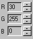 The second method is to use the up down gadgets located to the left of each text entry field. These allow you to increase or decrease the desired color component by clicking on the appropriate gadget (up for a value increase and down for a value decrease).