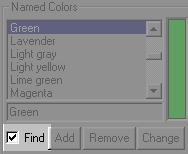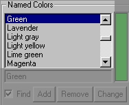 If you would like the list to remain alphabetical, you will need to manually select the appropriate location for the new named color. After you have the color set, named, and ready to go into the desired position in the list, press the Add button. This will automatically place the new name and color into the list, and make it the current named color. Remember, clicking on the named color preview box (to the right of the name list) will place the color in the current left color position as well as alter the RGB values to their appropriate settings.