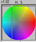 Throughout the remainder of the documentation the terms "left color" and "right color" will be used to describe the to palette position selectors. The "left color" is a white with black marker that outlines the current color. This color can be altered using the Hue and Saturation Color Wheel, or the provided RGB text entry fields. This color is the starting point for all spreads, fills, and mirrors. The left color position can be altered by clicking on the palette with the left mouse button. The "right color" is a blue and red marker which defines the ending position for all spreads fills and mirrors.