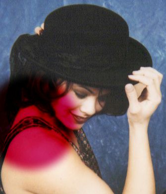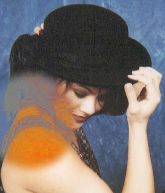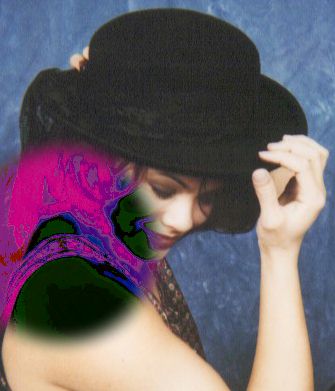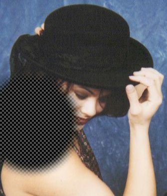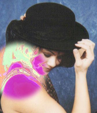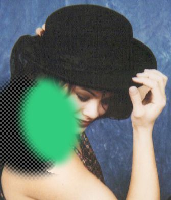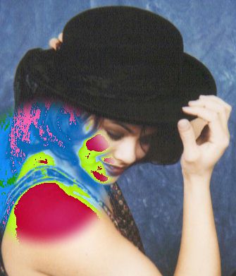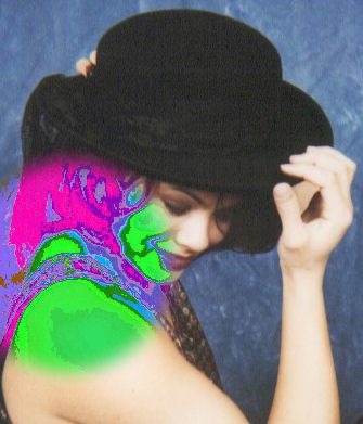 To demonstrate this, we used the cleared image (from the clear mode, above) and placed the blob image centered just to the left of Stacey's lips. The blob would have overwritten the exposed portion of her face, but behind mode protects existing pixel data.