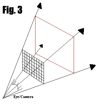 For clarity's sake, the "viewing frustrum" is the bounds in which the Ray Tracer's "eye" can see from it's location. A frustum is like a pyramid that never ends. Figure 3 is a diagram of the viewing frustrum.