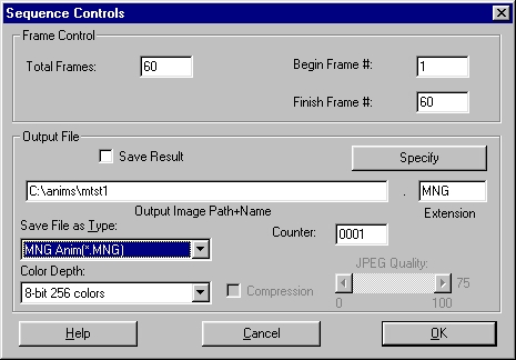 The bottom portion of the dialog allows you to Specify Output File name, extension, file type, and path. The file type specified in this panel is completely independent of the setting in the Save File As Type: option in the Save Image As dialog. The Save Result check box must be selected to save the frames as they are generated by the Timeline. This allows you to create FLI/FLC and AVI animations while the sequence is generating. This method of creating the animation files is preferred over saving the filmstrip as an animation file because it saves time and memory.