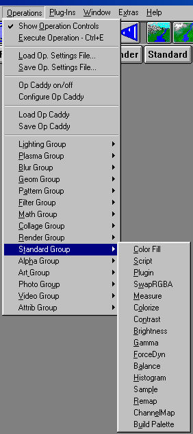 Individual operations can also be selected using the Operations Pull Down Menu. An operation can be selected from the menu by clicking on the name of its group, and then on the specific operation.